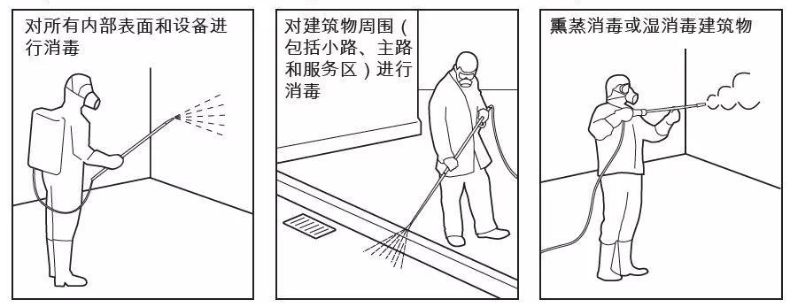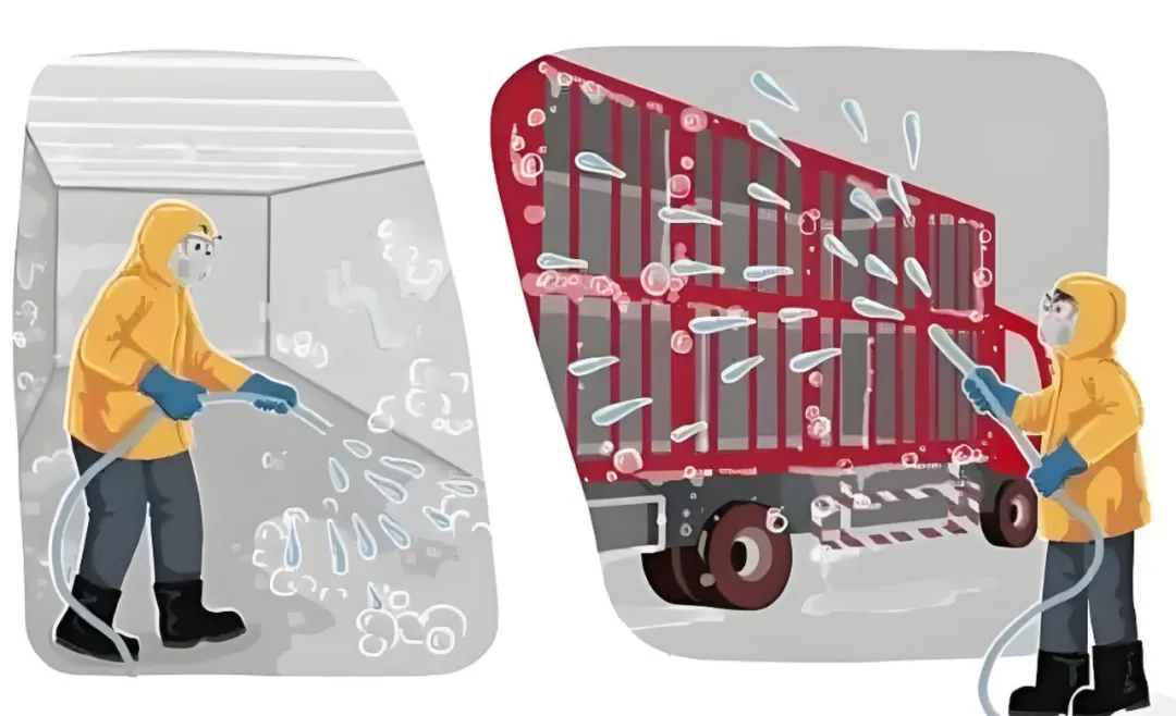 車(chē)輛的洗消流程:清水清洗,打泡沫清洗劑浸泡15分鐘,高壓水清洗,消毒劑按比例說(shuō)明配置,噴灑靜置30分鐘后瀝干水分,70℃高溫烘干30分鐘后,停放在指定位置,如有可能,可陽(yáng)光暴曬。